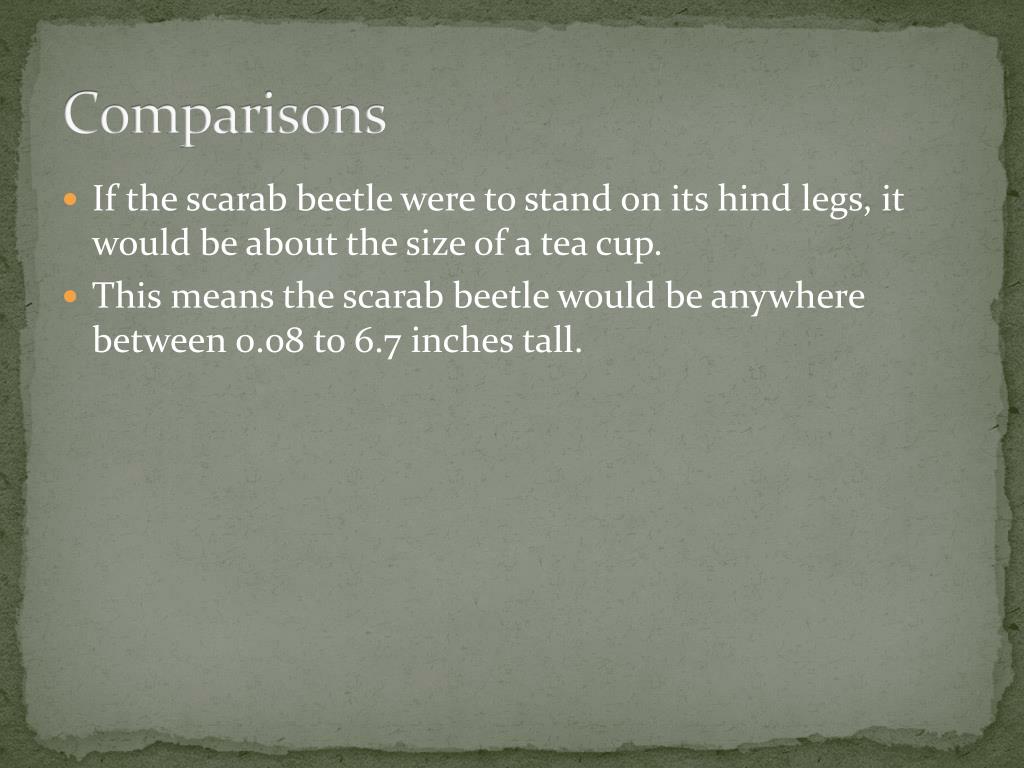 Comparisons • If the scarab beetle were to stand on its hind legs, it would be about the size of a tea cup. • This means the scarab beetle would be anywhere between 0.08 to 6.7 inches tall.