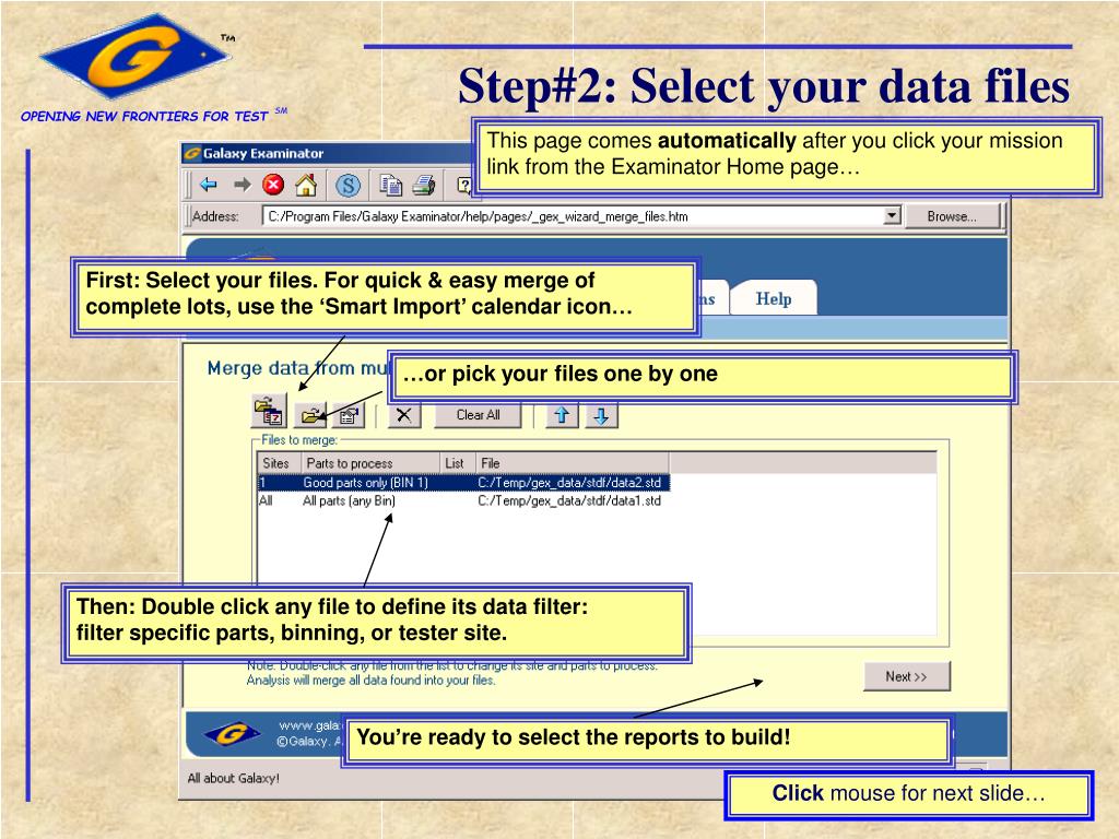 This page comes automatically after you click your mission link from the Examinator Home page… First: Select your files. For quick & easy merge of complete lots, use the ‘Smart Import’ calendar icon… …or pick your files one by one Then: Double click any file to define its data filter: filter specific parts, binning, or tester site. You’re ready to select the reports to build! Step#2: Select your data files Click mouse for next slide…