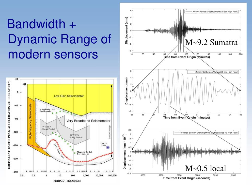 Bandwidth +Dynamic Range of modern sensors M~9.2 Sumatra M~0.5 local