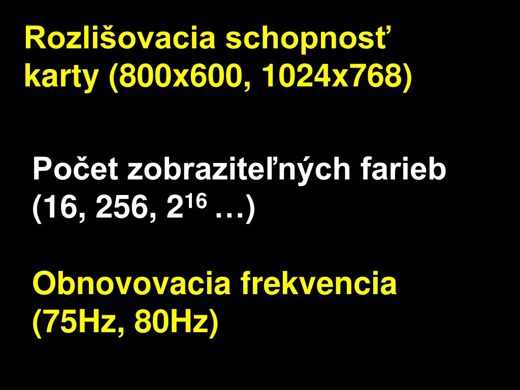Rozlišovacia schopnosť karty (800x600, 1024x768) Počet zobraziteľných farieb (16, 256, 216 …) Obnovovacia frekvencia (75Hz, 80Hz)