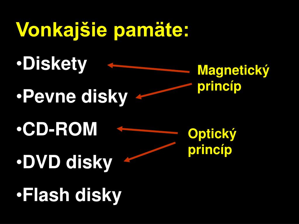 Vonkajšie pamäte: • Diskety • Pevne disky • CD-ROM • DVD disky • Flash disky Magnetický princíp Optický princíp