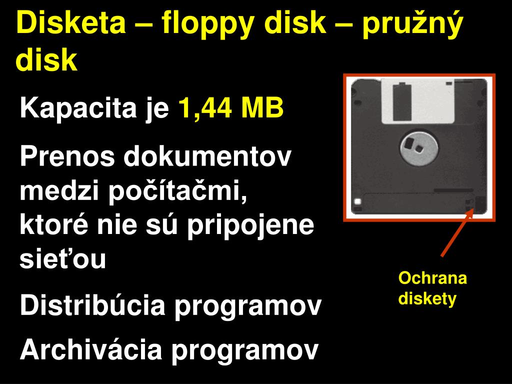 Disketa – floppy disk – pružný disk Kapacita je 1,44 MB Prenos dokumentov medzi počítačmi, ktoré nie sú pripojene sieťou Ochrana diskety Distribúcia programov Archivácia programov