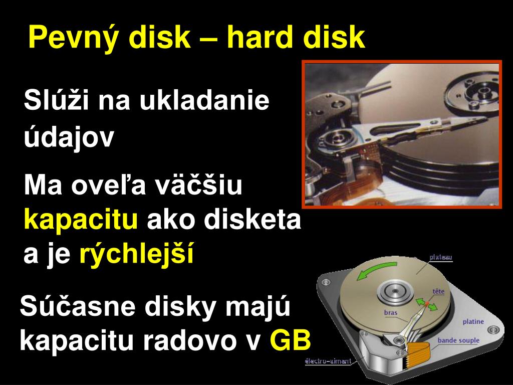 Pevný disk – hard disk Slúži na ukladanie údajov Ma oveľa väčšiu kapacitu ako disketa a je rýchlejší Súčasne disky majú kapacitu radovo v GB