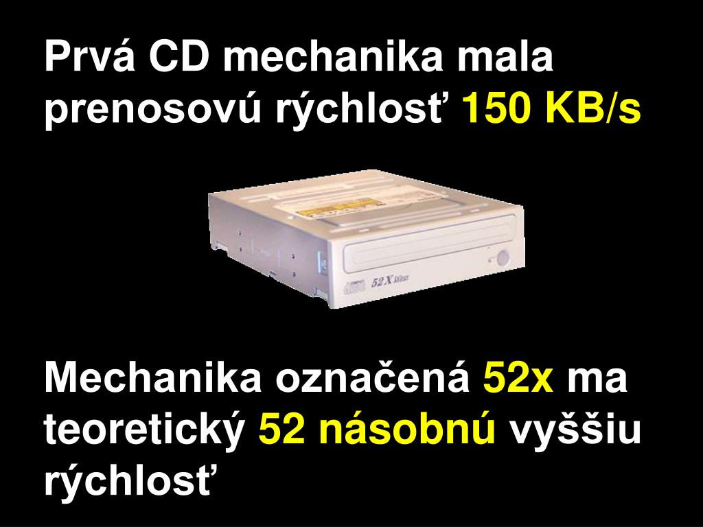 Prvá CD mechanika mala prenosovú rýchlosť 150 KB/s Mechanika označená 52x ma teoretický 52 násobnú vyššiu rýchlosť