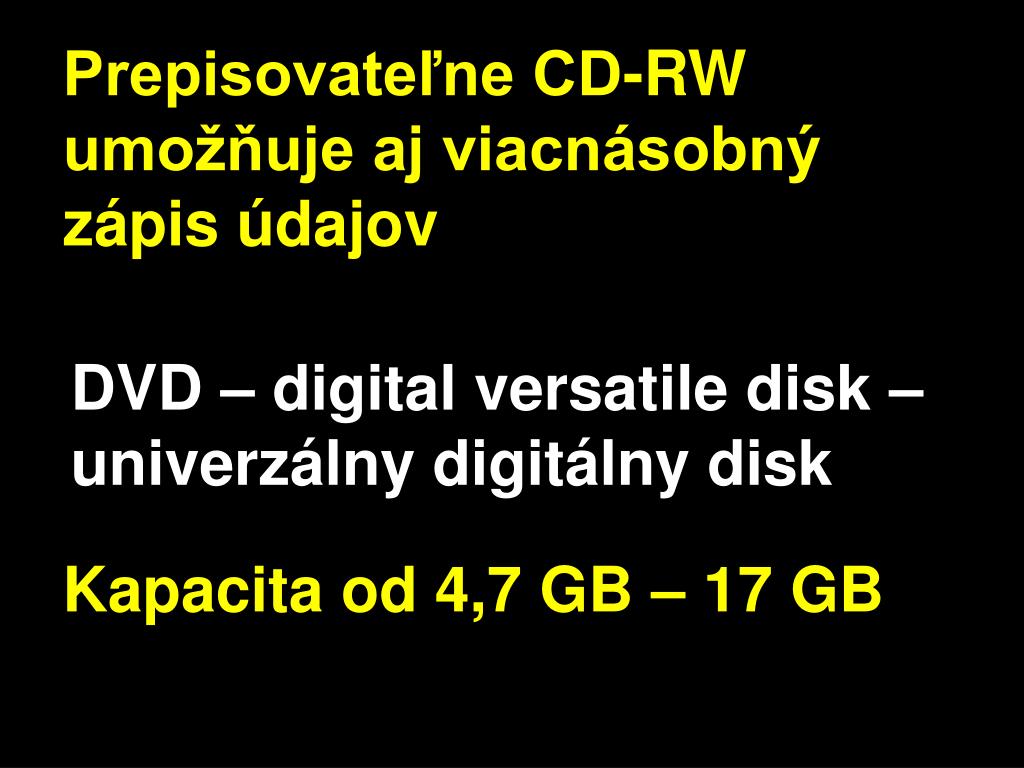 Prepisovateľne CD-RW umožňuje aj viacnásobný zápis údajov DVD – digital versatile disk – univerzálny digitálny disk Kapacita od 4,7 GB – 17 GB