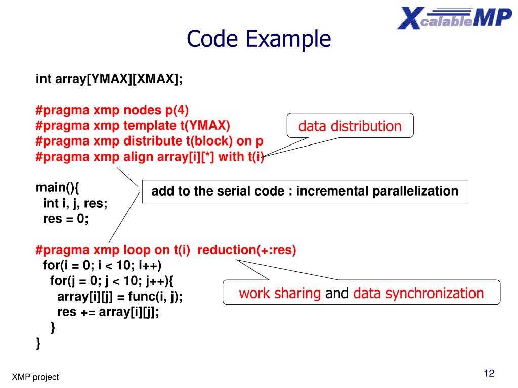 Code Example int array[YMAX][XMAX]; #pragma xmp nodes p(4) #pragma xmp template t(YMAX) #pragma xmp distribute t(block) on p #pragma xmp align array[i][*] with t(i) main(){ int i, j, res; res = 0; #pragma xmp loop on t(i) reduction(+:res) for(i = 0; i < 10; i++) for(j = 0; j < 10; j++){ array[i][j] = func(i, j); res += array[i][j]; } } data distribution add to the serial code : incremental parallelization work sharing and data synchronization XMP project