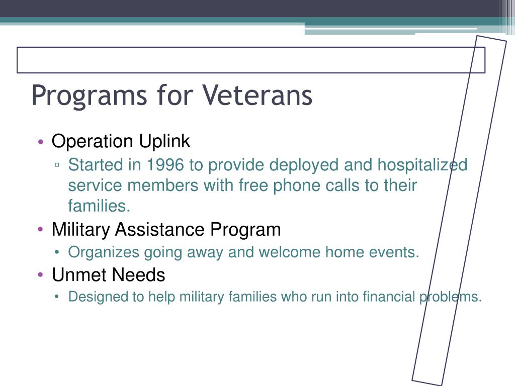 Programs for Veterans • Operation Uplink • Started in 1996 to provide deployed and hospitalized service members with free phone calls to their families. • Military Assistance Program • Organizes going away and welcome home events. • Unmet Needs • Designed to help military families who run into financial problems.