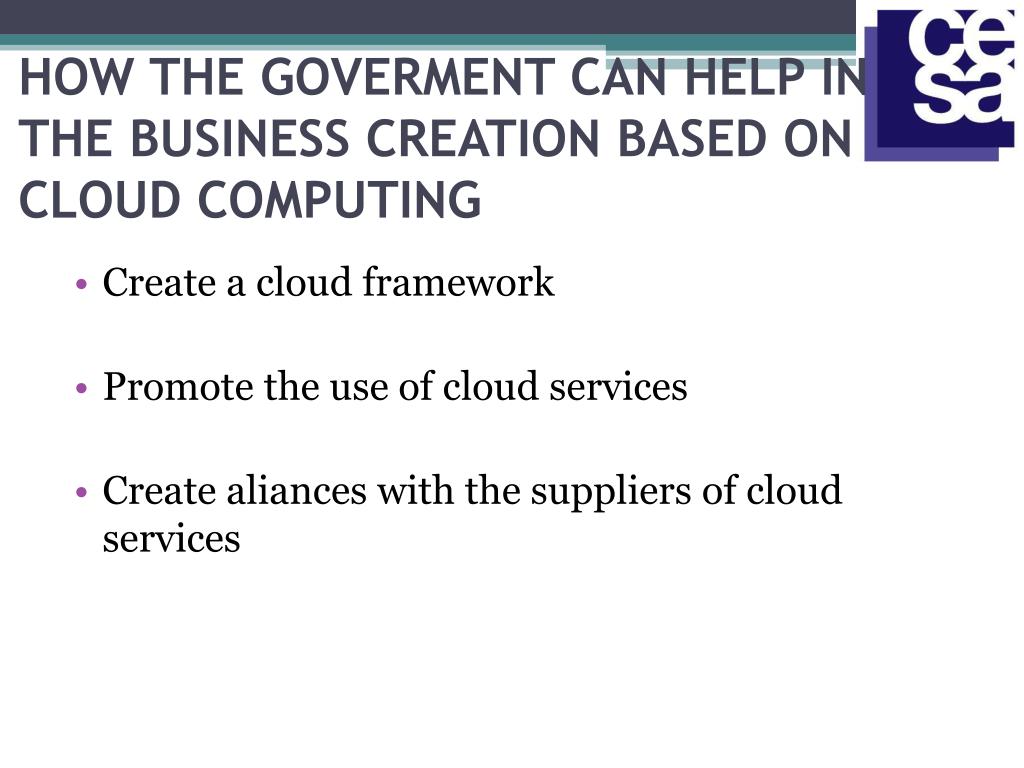 how the goverment can help in the business creation based on cloud computing • Create a cloud framework • Promote the use of cloud services • Create aliances with the suppliers of cloud services