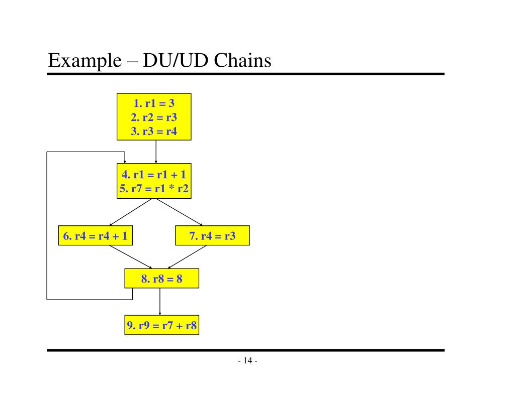 Example – DU/UD Chains 1. r1 = 3 2. r2 = r3 3. r3 = r4 4. r1 = r1 + 1 5. r7 = r1 * r2 6. r4 = r4 + 1 7. r4 = r3 8. r8 = 8 9. r9 = r7 + r8