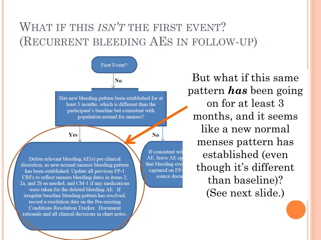 What if this isn’t the first event? (New normal menses pattern established during follow-up) • If during follow-up a new recurrent bleeding pattern is considered to be consistent with a normal menstrual cycle, (even if different from the participant’s baseline pattern), any previously reported AEs related to this bleeding should be deleted. • Clinical judgment should be used and based on a population definition of normal menses (i.e., regularly timed bleeding approximately 4 weeks apart), regardless of whether it is consistent with the participant’s baseline bleeding pattern. • It is recommended that the new pattern be established for at least 3 cycles before making this determination. • When/if any AEs are deleted, ensure the rationale is clearly documented in source documents.