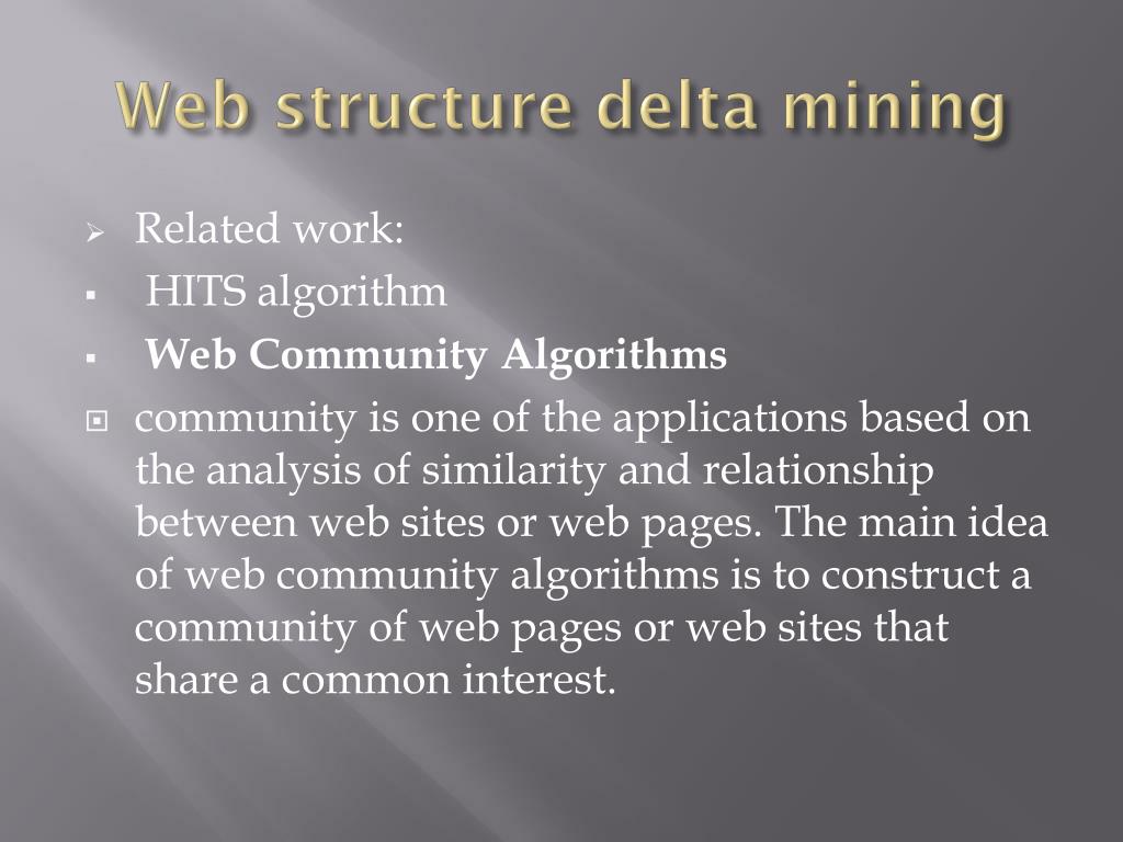 Web structure delta mining • Related work: • HITS algorithm • Web Community Algorithms • community is one of the applications based on the analysis of similarity and relationship between web sites or web pages. The main idea of web community algorithms is to construct a community of web pages or web sites that share a common interest.