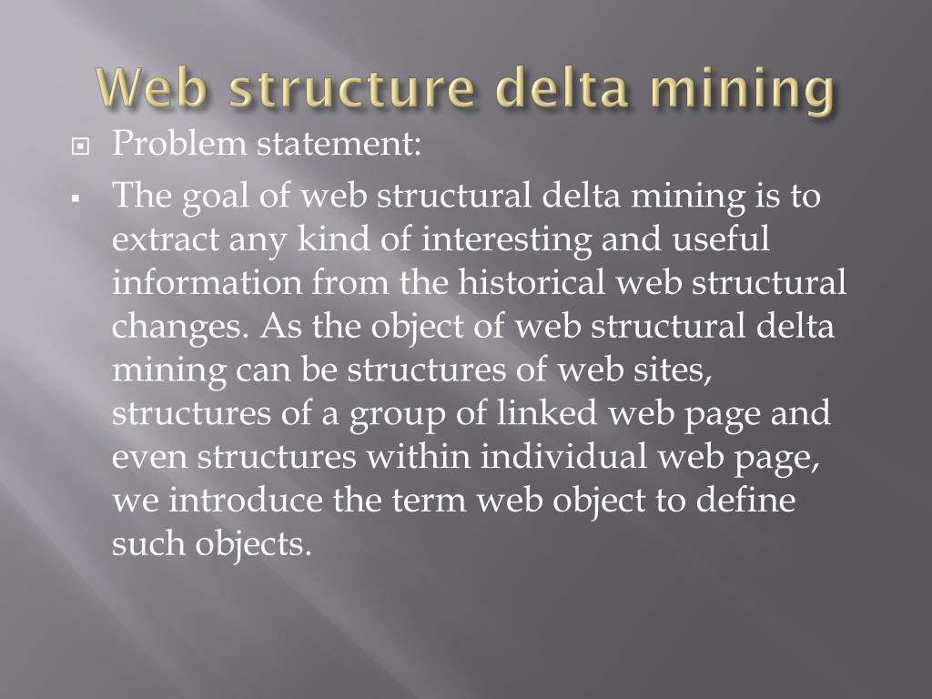 Web structure delta mining • Problem statement: • The goal of web structural delta mining is to extract any kind of interesting and useful information from the historical web structural changes. As the object of web structural delta mining can be structures of web sites, structures of a group of linked web page and even structures within individual web page, we introduce the term web object to define such objects.