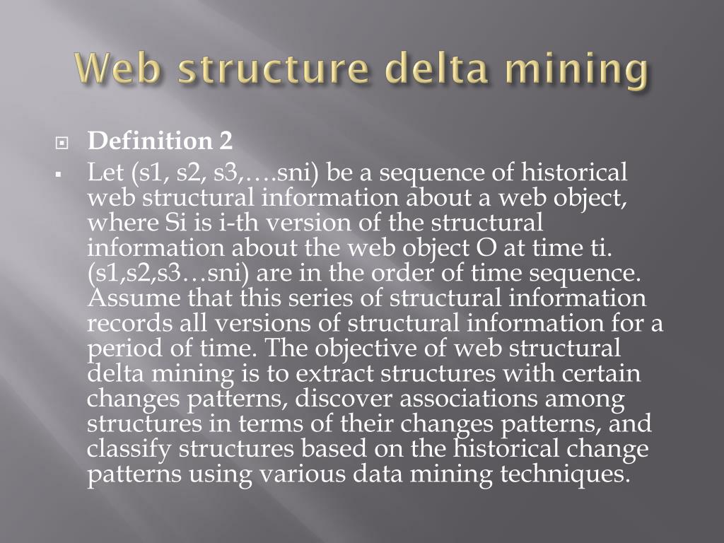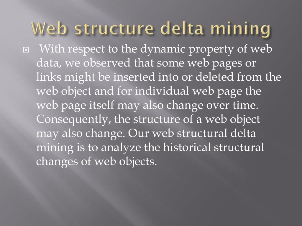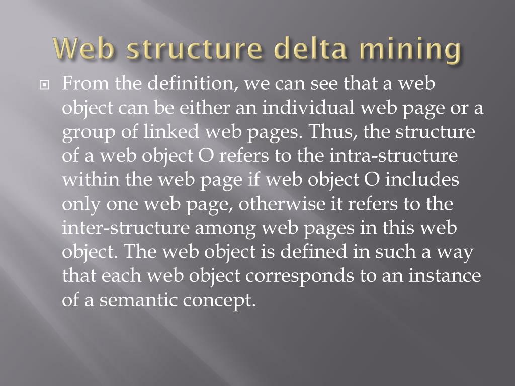 Web structure delta mining • From the definition, we can see that a web object can be either an individual web page or a group of linked web pages. Thus, the structure of a web object O refers to the intra-structure within the web page if web object O includes only one web page, otherwise it refers to the inter-structure among web pages in this web object. The web object is defined in such a way that each web object corresponds to an instance of a semantic concept.