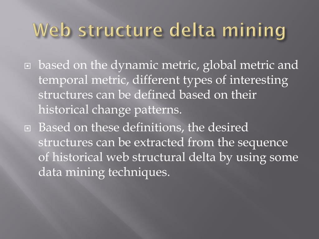 Web structure delta mining • based on the dynamic metric, global metric and temporal metric, different types of interesting structures can be defined based on their historical change patterns. • Based on these definitions, the desired structures can be extracted from the sequence of historical web structural delta by using some data mining techniques.