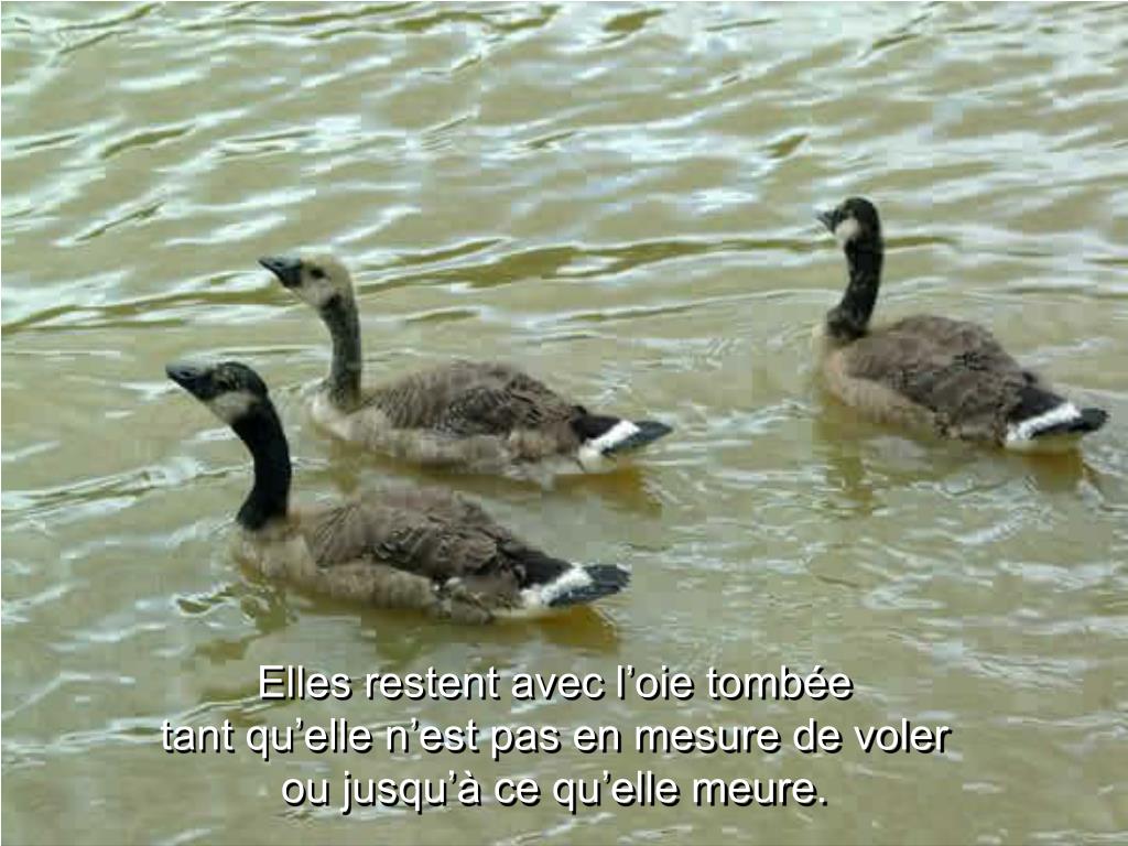 Enfin (et ceci est important) lorsqu’une oie tombe malade ou est blessée par un coup de fusil et qu’elle quitte la formation, deux autres oies sortent du groupe en même temps qu’elle et la suivent pour lui porter aide et protection.