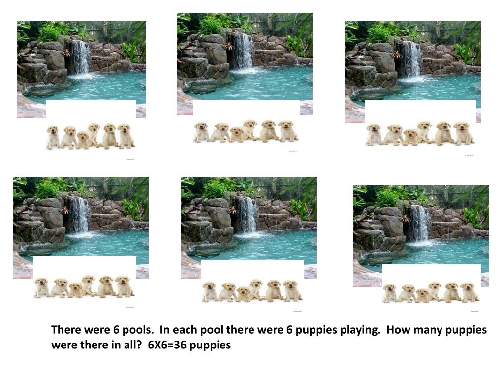 There were 6 pools. In each pool there were 6 puppies playing. How many puppies were there in all? 6X6=36 puppies