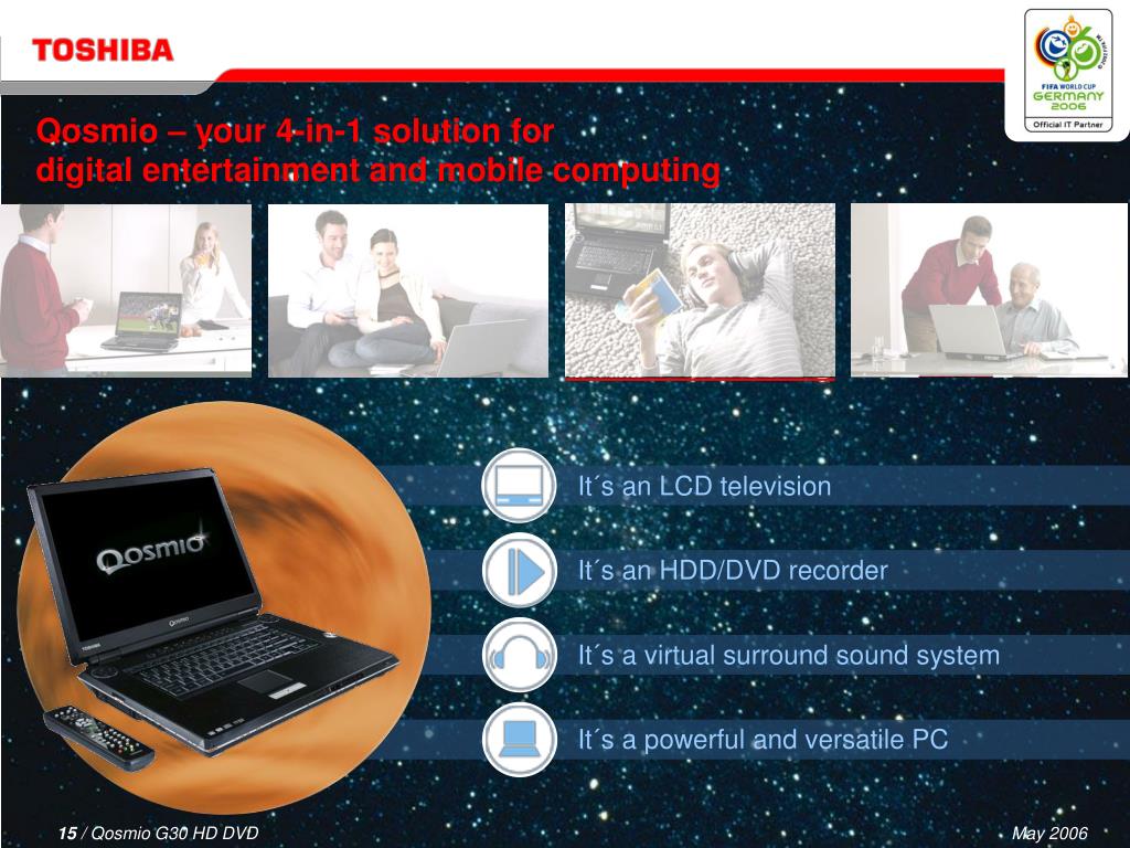 Qosmio – your 4-in-1 solution for digital entertainment and mobile computing It´s an LCD television It´s an HDD/DVD recorder It´s a virtual surround sound system It´s a powerful and versatile PC 15/ Qosmio G30 HD DVD