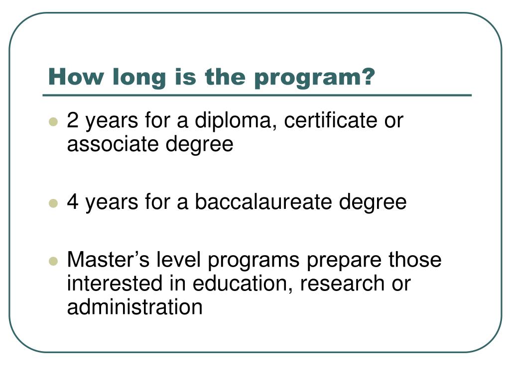 How long is the program? • 2 years for a diploma, certificate or associate degree • 4 years for a baccalaureate degree • Master’s level programs prepare those interested in education, research or administration