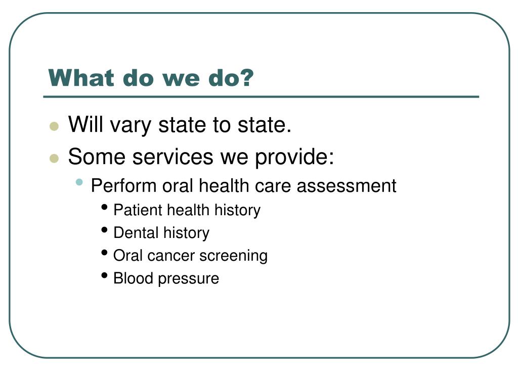 What do we do? • Will vary state to state. • Some services we provide: • Perform oral health care assessment • Patient health history • Dental history • Oral cancer screening • Blood pressure