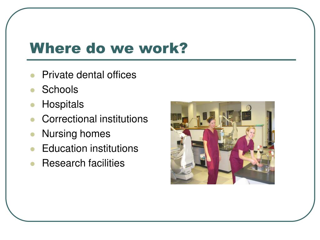 Where do we work? • Private dental offices • Schools • Hospitals • Correctional institutions • Nursing homes • Education institutions • Research facilities