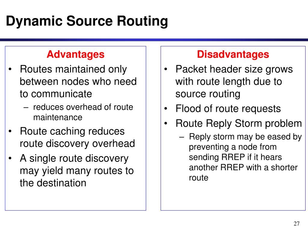 Dynamic Source Routing Advantages • Routes maintained only between nodes who need to communicate • reduces overhead of route maintenance • Route caching reduces route discovery overhead • A single route discovery may yield many routes to the destination Disadvantages • Packet header size grows with route length due to source routing • Flood of route requests • Route Reply Storm problem • Reply storm may be eased by preventing a node from sending RREP if it hears another RREP with a shorter route