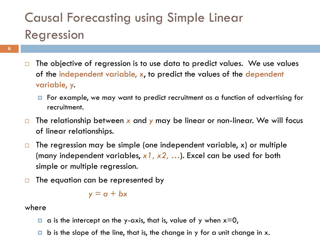 Causal Forecasting using Simple Linear Regression • The objective of regression is to use data to predict values. We use values of the independent variable, x, to predict the values of the dependent variable, y. • For example, we may want to predict recruitment as a function of advertising for recruitment. • The relationship between x and y may be linear or non-linear. We will focus of linear relationships. • The regression may be simple (one independent variable, x) or multiple (many independent variables, x1, x2, …). Excel can be used for both simple or multiple regression. • The equation can be represented by y = a + bx where • a is the intercept on the y-axis, that is, value of y when x=0, • b is the slope of the line, that is, the change in y for a unit change in x.
