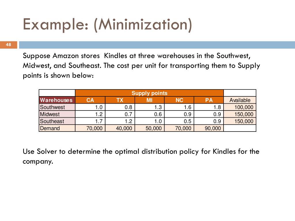 Example: (Minimization) Suppose Amazon stores Kindles at three warehouses in the Southwest, Midwest, and Southeast. The cost per unit for transporting them to Supply points is shown below: Use Solver to determine the optimal distribution policy for Kindles for the company.