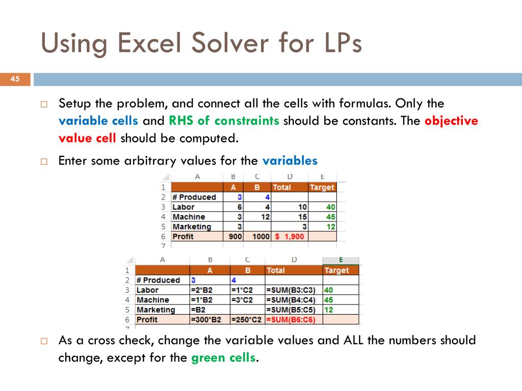 Using Excel Solver for LPs • Setup the problem, and connect all the cells with formulas. Only the variable cells and RHS of constraints should be constants. The objective value cell should be computed. • Enter some arbitrary values for the variables • As a cross check, change the variable values and ALL the numbers should change, except for the green cells.