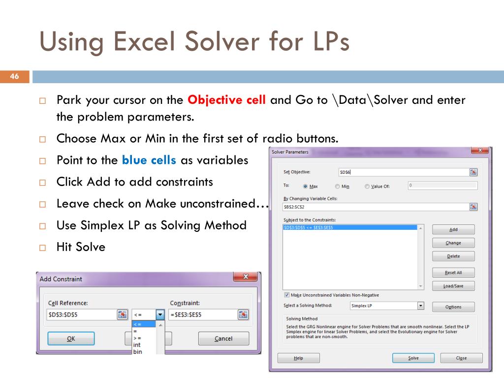 Using Excel Solver for LPs • Park your cursor on the Objective cell and Go to \Data\Solver and enter the problem parameters. • Choose Max or Min in the first set of radio buttons. • Point to the blue cells as variables • Click Add to add constraints • Leave check on Make unconstrained… • Use Simplex LP as Solving Method • Hit Solve