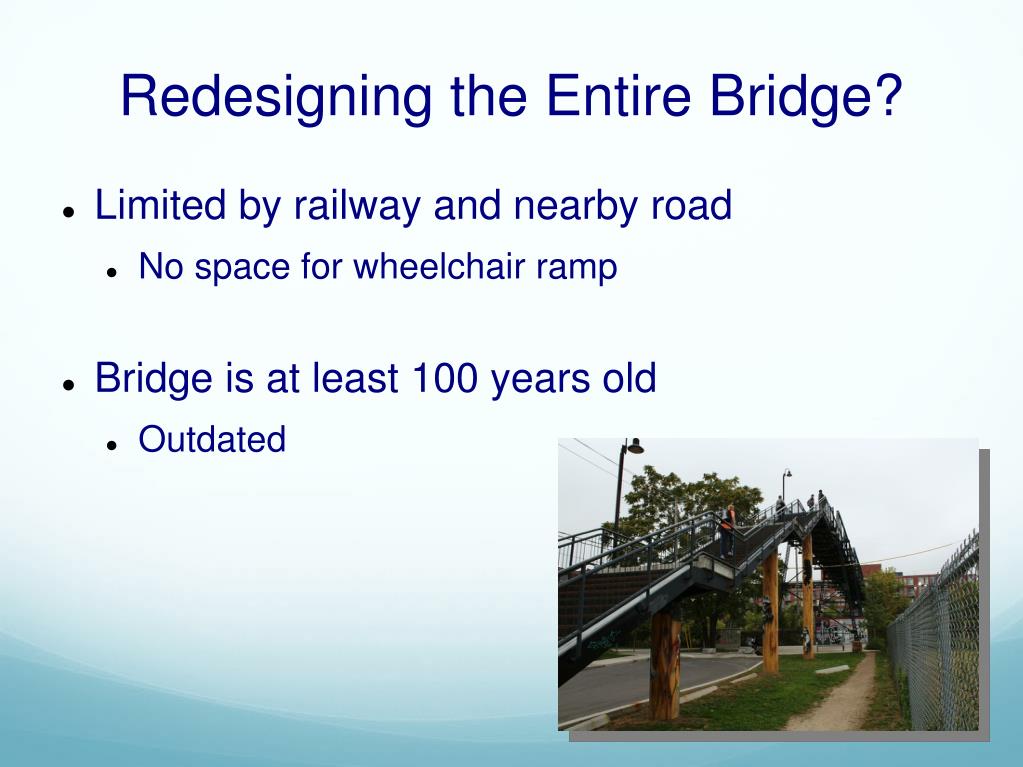 Redesigning the Entire Bridge? • Limited by railway and nearby road • No space for wheelchair ramp • Bridge is at least 100 years old • Outdated
