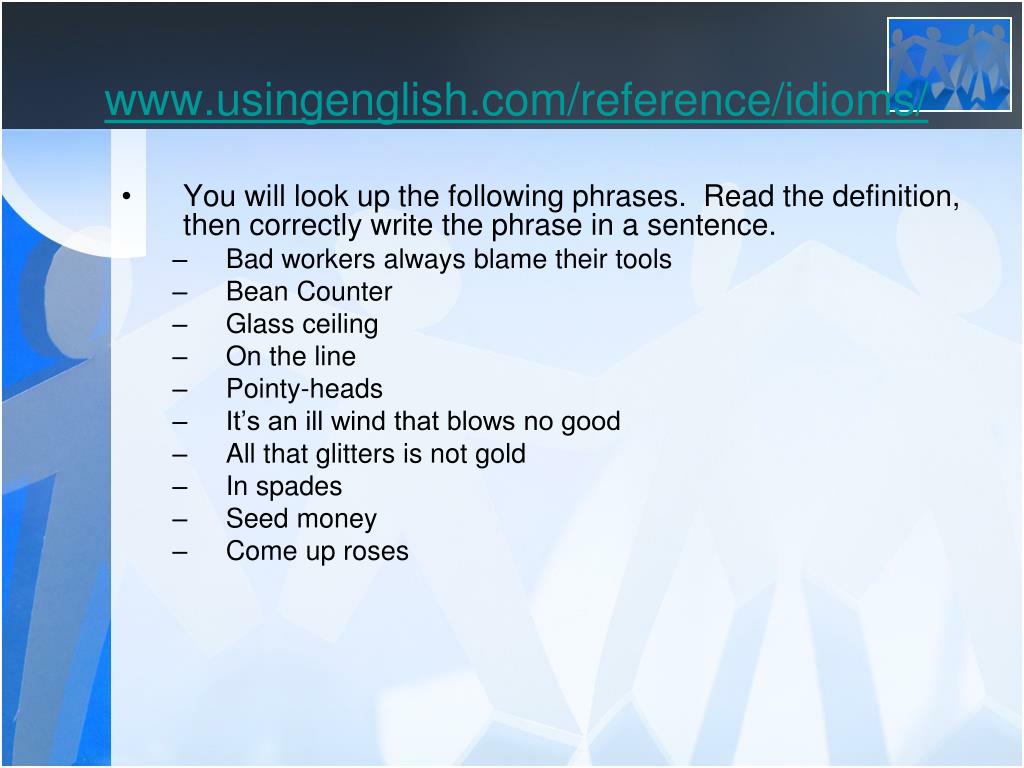 www.usingenglish.com/reference/idioms/ • You will look up the following phrases. Read the definition, then correctly write the phrase in a sentence. • Bad workers always blame their tools • Bean Counter • Glass ceiling • On the line • Pointy-heads • It’s an ill wind that blows no good • All that glitters is not gold • In spades • Seed money • Come up roses