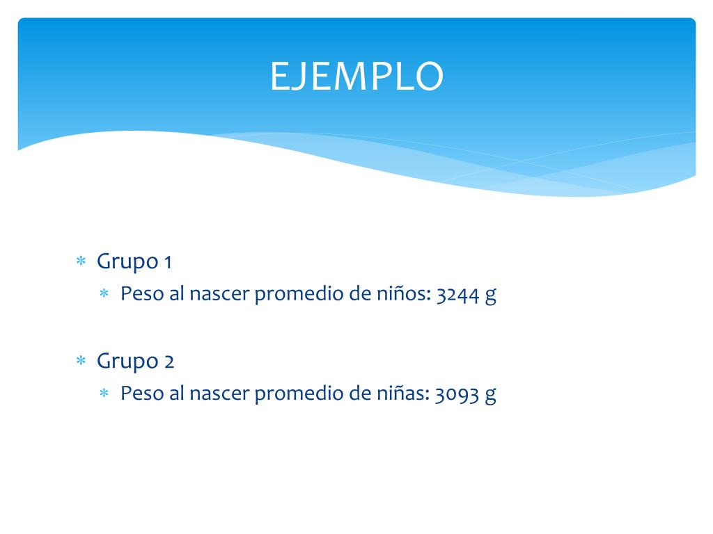 EJEMPLO • Grupo 1 • Peso al nascer promedio de niños: 3244 g • Grupo 2 • Peso al nascer promedio de niñas: 3093 g