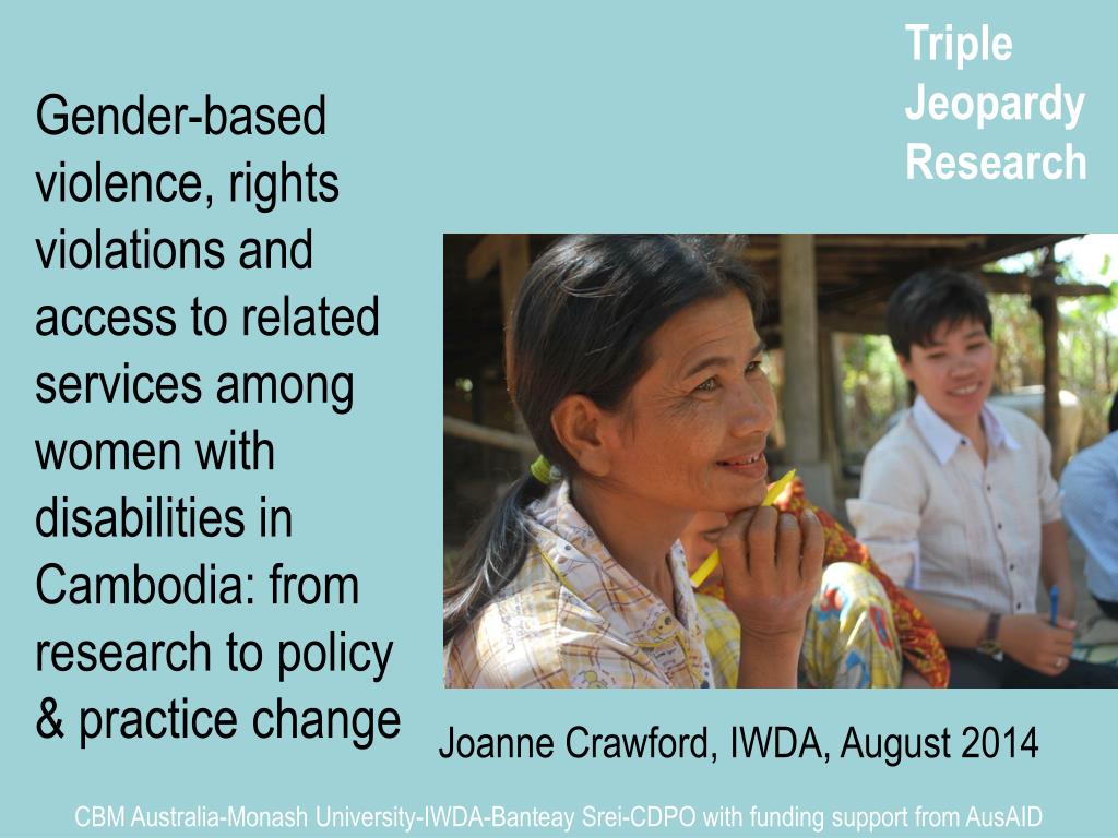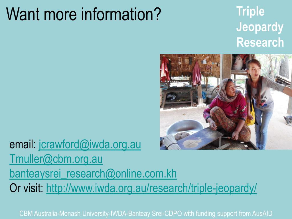 Want more information? email: jcrawford@iwda.org.au Tmuller@cbm.org.au banteaysrei_research@online.com.kh Or visit: http://www.iwda.org.au/research/triple-jeopardy/