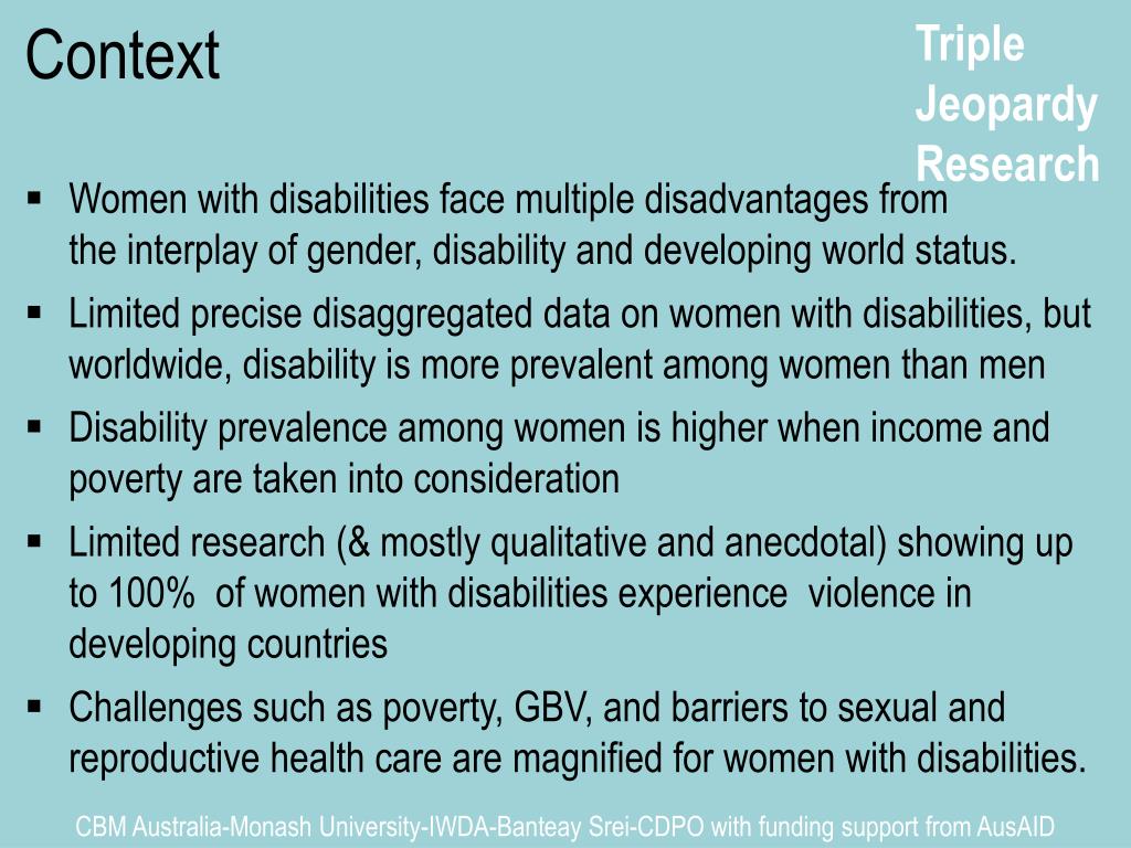 Gender-based violence, rights violations and access to related services among women with disabilities in Cambodia: from research to policy & practice change. Joanne Crawford, IWDA, August 2014. Context.