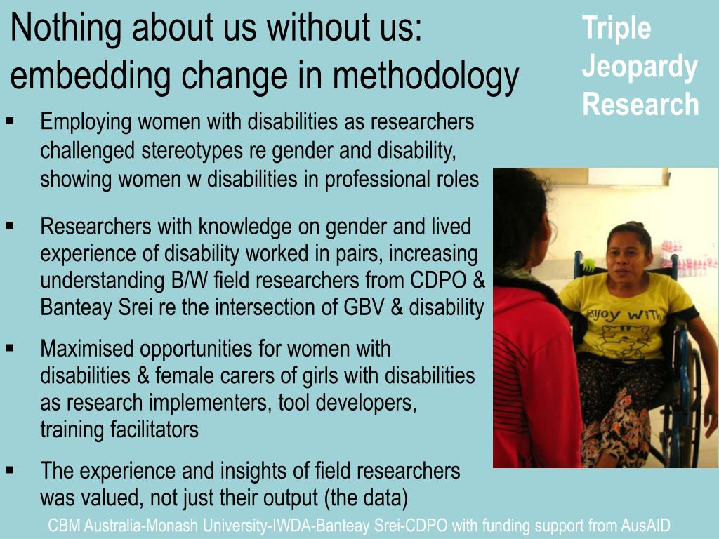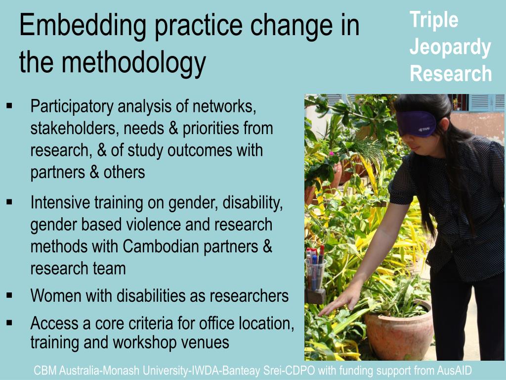 Embedding practice change in the methodology • Participatory analysis of networks, stakeholders, needs & priorities from research, & of study outcomes with partners & others • Intensive training on gender, disability, gender based violence and research methods with Cambodian partners & research team • Women with disabilities as researchers • Access a core criteria for office location, training and workshop venues