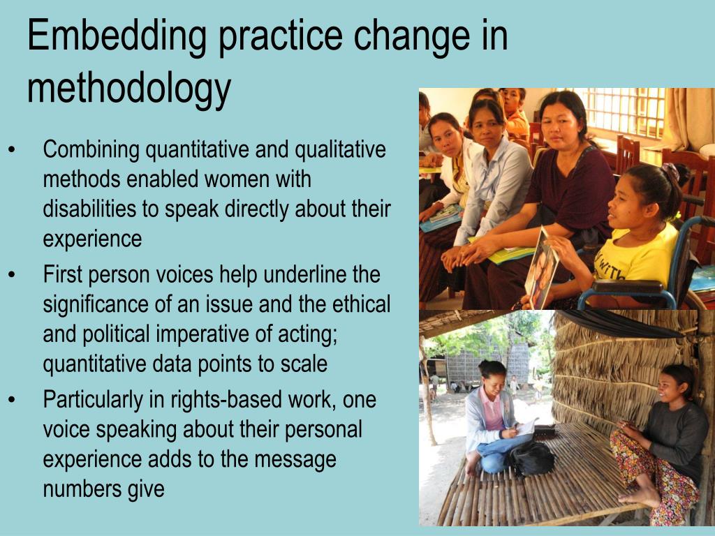 Embedding practice change in methodology • Combining quantitative and qualitative methods enabled women with disabilities to speak directly about their experience • First person voices help underline the significance of an issue and the ethical and political imperative of acting; quantitative data points to scale • Particularly in rights-based work, one voice speaking about their personal experience adds to the message numbers give