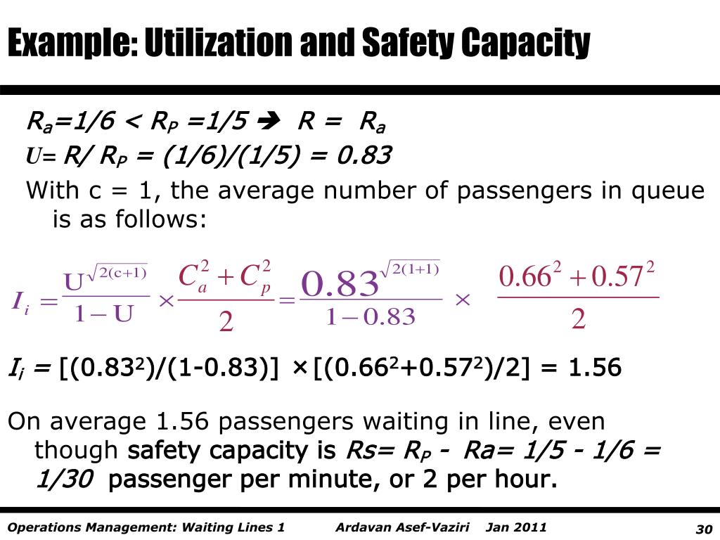 Example: Utilization and Safety Capacity Ra=1/6 < RP =1/5 R = Ra U= R/ RP = (1/6)/(1/5) = 0.83 With c = 1, the average number of passengers in queue is as follows: Ii = [(0.832)/(1-0.83)] ×[(0.662+0.572)/2] = 1.56 On average 1.56 passengers waiting in line, even though safety capacity is Rs= RP - Ra= 1/5 - 1/6 = 1/30 passenger per minute, or 2 per hour.
