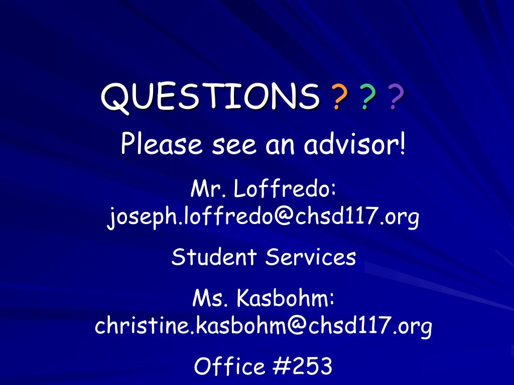 QUESTIONS ??? Please see an advisor! Mr. Loffredo: joseph.loffredo@chsd117.org Student Services Ms. Kasbohm: christine.kasbohm@chsd117.org Office #253