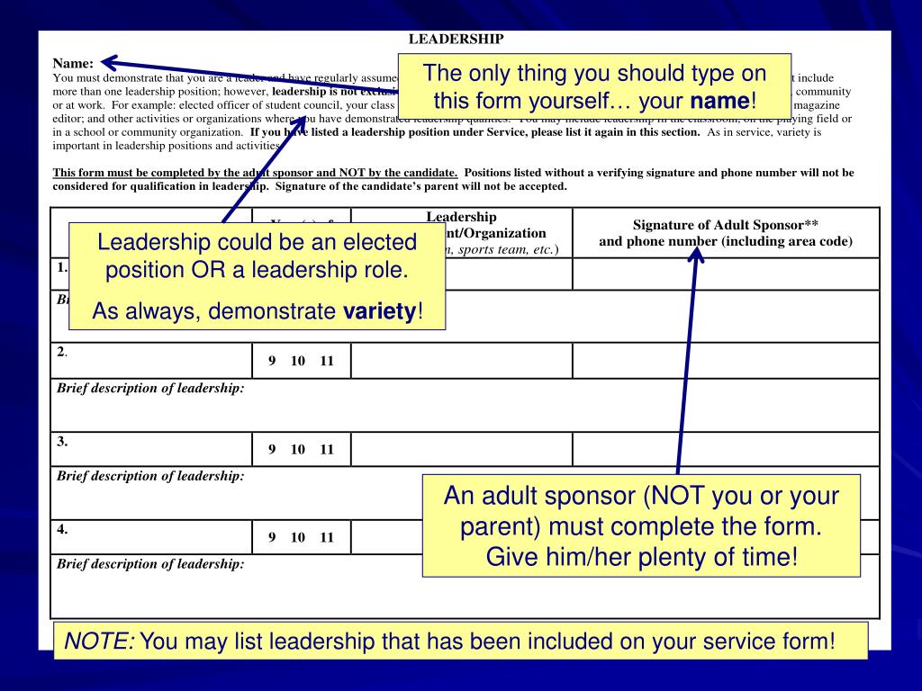 The only thing you should type on this form yourself… your name! Leadership could be an elected position OR a leadership role. As always, demonstrate variety! An adult sponsor (NOT you or your parent) must complete the form. Give him/her plenty of time! NOTE: You may list leadership that has been included on your service form!