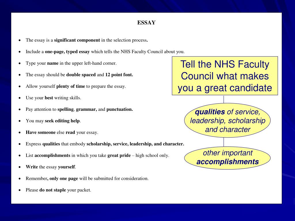 qualities of service, leadership, scholarship and character other important accomplishments Tell the NHS Faculty Council what makes you a great candidate