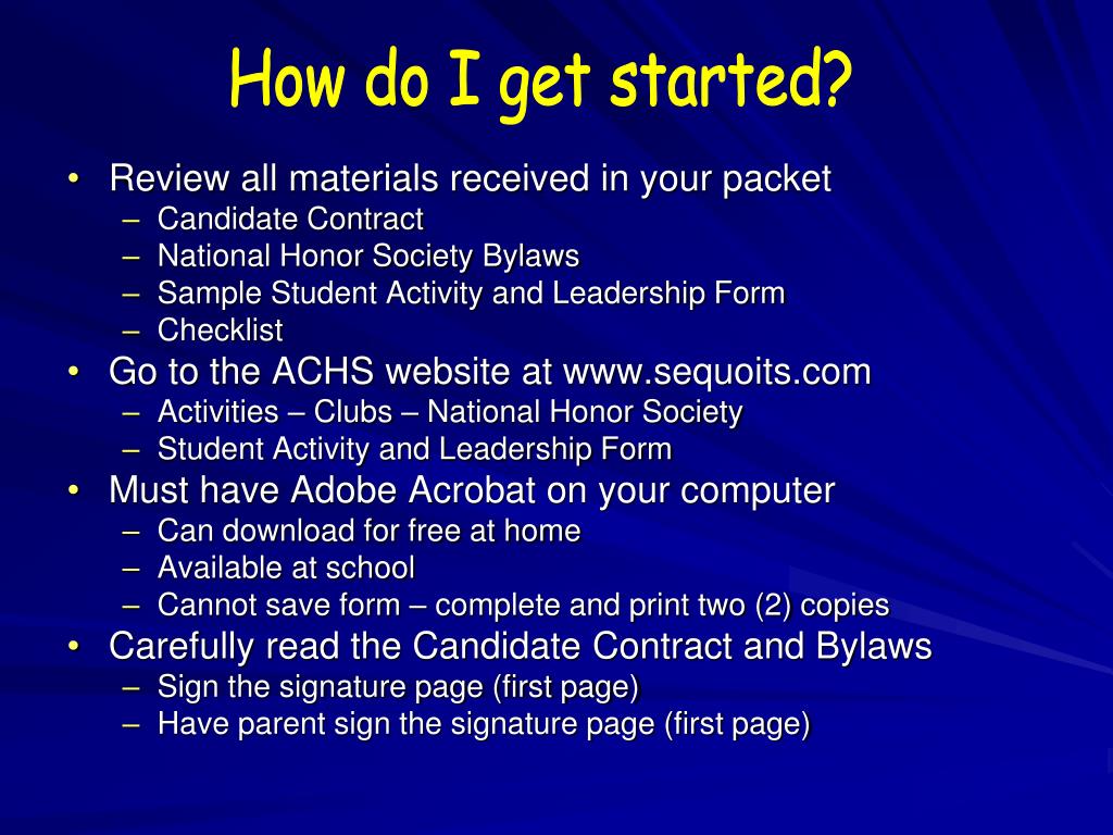 How do I get started? • Review all materials received in your packet • Candidate Contract • National Honor Society Bylaws • Sample Student Activity and Leadership Form • Checklist • Go to the ACHS website at www.sequoits.com • Activities – Clubs – National Honor Society • Student Activity and Leadership Form • Must have Adobe Acrobat on your computer • Can download for free at home • Available at school • Cannot save form – complete and print two (2) copies • Carefully read the Candidate Contract and Bylaws • Sign the signature page (first page) • Have parent sign the signature page (first page)