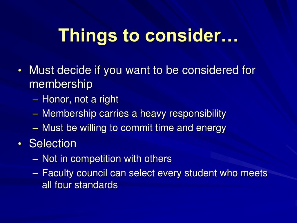 Things to consider… • Must decide if you want to be considered for membership • Honor, not a right • Membership carries a heavy responsibility • Must be willing to commit time and energy • Selection • Not in competition with others • Faculty council can select every student who meets all four standards