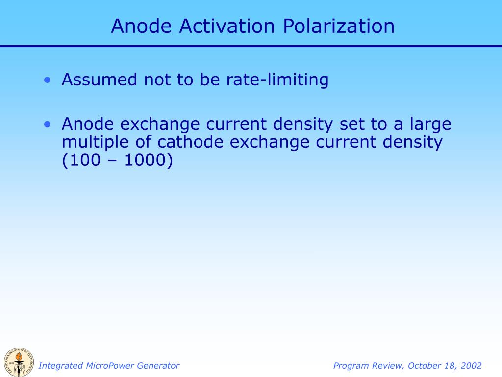 Anode Activation Polarization • Assumed not to be rate-limiting • Anode exchange current density set to a large multiple of cathode exchange current density (100 – 1000)