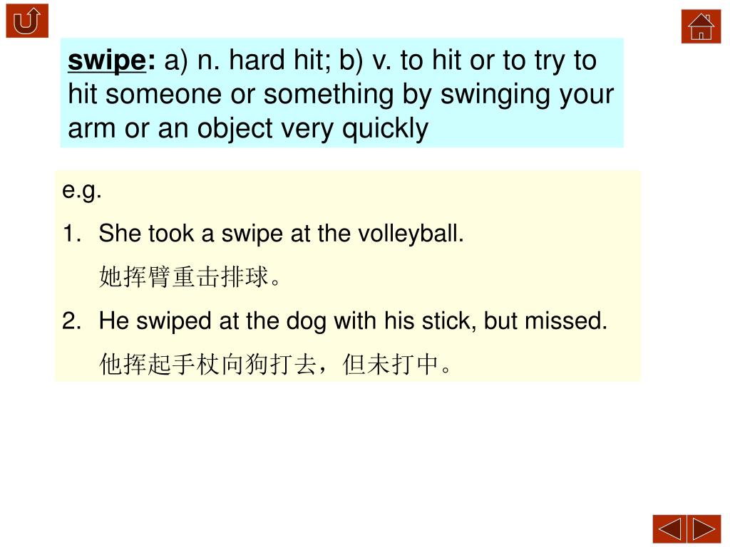 swipe: a) n. hard hit; b) v. to hit or to try to hit someone or something by swinging your arm or an object very quickly • e.g. • She took a swipe at the volleyball. • 她挥臂重击排球。 • He swiped at the dog with his stick, but missed. • 他挥起手杖向狗打去,但未打中。