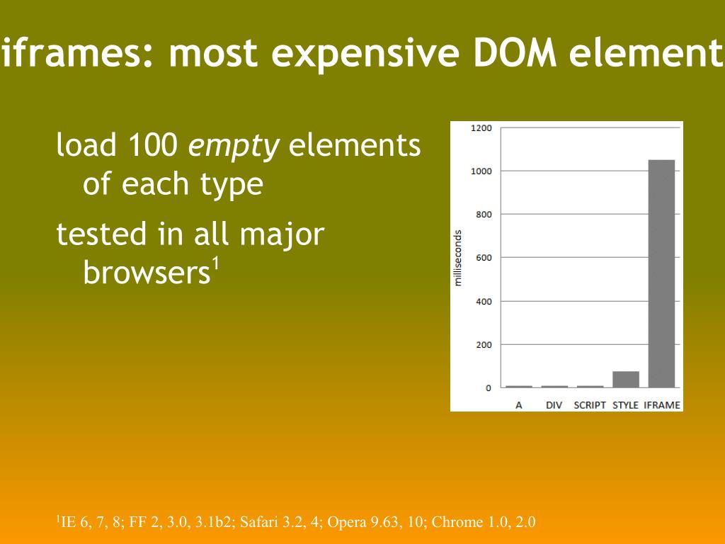 iframes: most expensive DOM element load 100 empty elements of each type tested in all major browsers1 1IE 6, 7, 8; FF 2, 3.0, 3.1b2; Safari 3.2, 4; Opera 9.63, 10; Chrome 1.0, 2.0