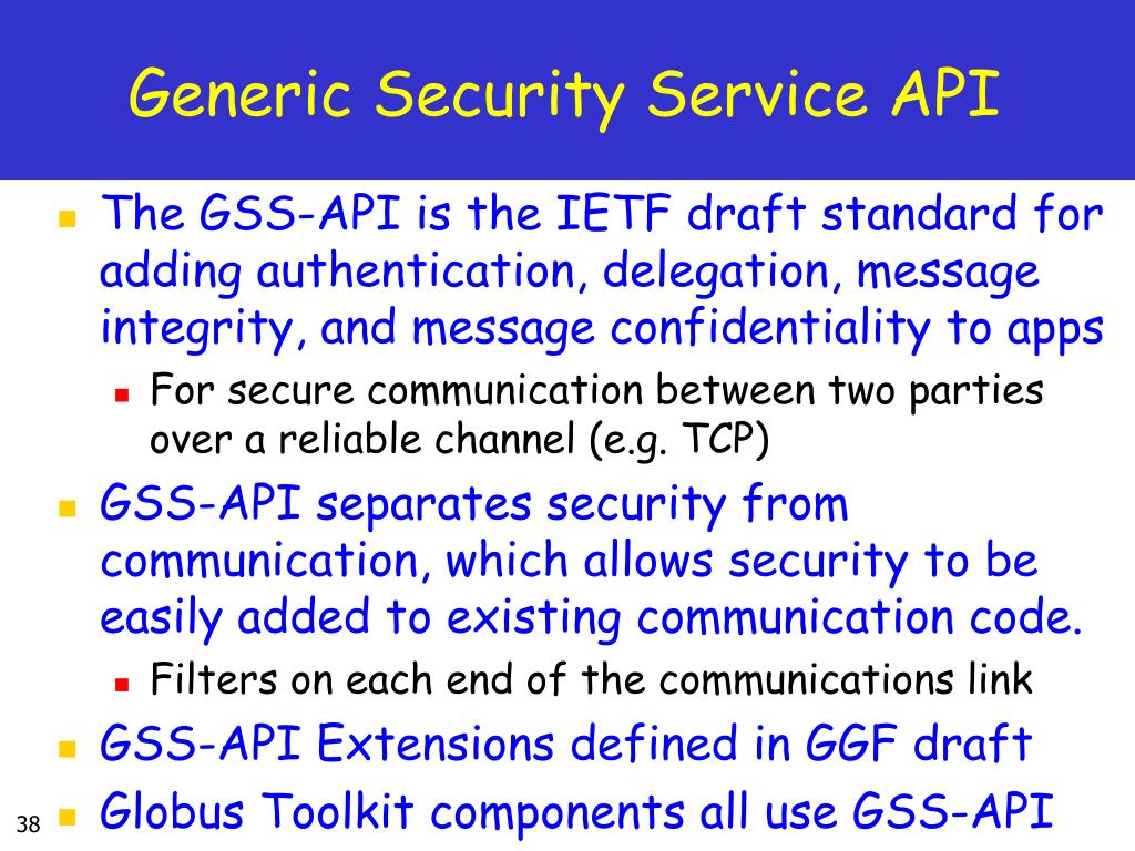 Generic Security Service API • The GSS-API is the IETF draft standard for adding authentication, delegation, message integrity, and message confidentiality to apps • For secure communication between two parties over a reliable channel (e.g. TCP) • GSS-API separates security from communication, which allows security to be easily added to existing communication code. • Filters on each end of the communications link • GSS-API Extensions defined in GGF draft • Globus Toolkit components all use GSS-API