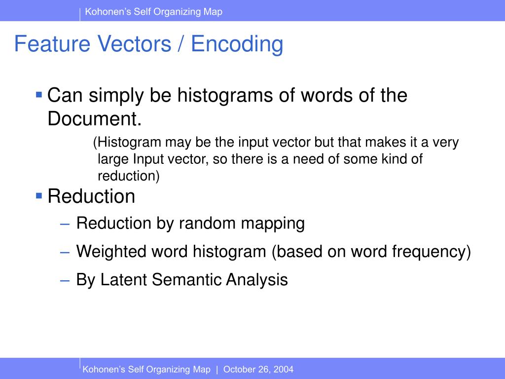 Feature Vectors / Encoding • Can simply be histograms of words of the Document. • (Histogram may be the input vector but that makes it a very large Input vector, so there is a need of some kind of reduction) • Reduction • Reduction by random mapping • Weighted word histogram (based on word frequency) • By Latent Semantic Analysis