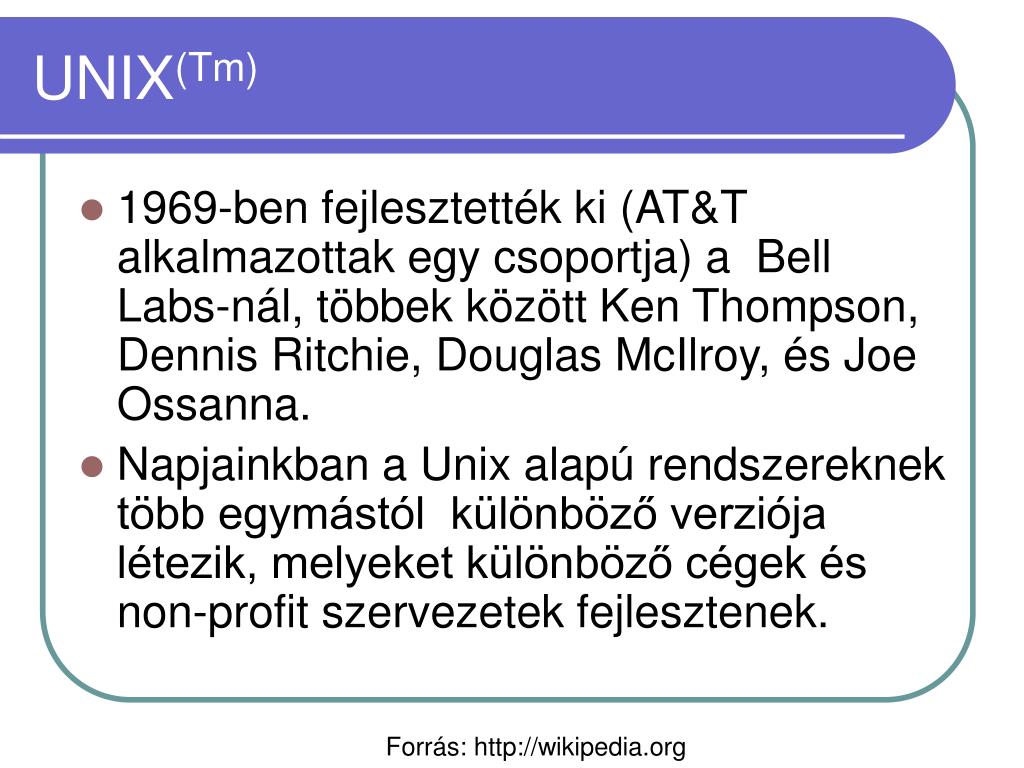 UNIX(Tm) • 1969-ben fejlesztették ki (AT&T alkalmazottak egy csoportja) a Bell Labs-nál, többek között Ken Thompson, Dennis Ritchie, Douglas McIlroy, és Joe Ossanna. • Napjainkban a Unix alapú rendszereknek több egymástól különböző verziója létezik, melyeket különböző cégek és non-profit szervezetek fejlesztenek. Forrás: http://wikipedia.org