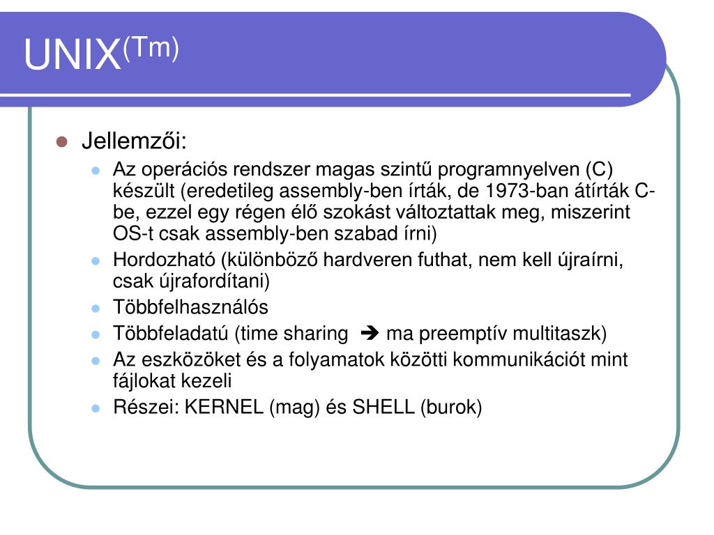 UNIX(Tm) • Jellemzői: • Az operációs rendszer magas szintű programnyelven (C) készült (eredetileg assembly-ben írták, de 1973-ban átírták C-be, ezzel egy régen élő szokást változtattak meg, miszerint OS-t csak assembly-ben szabad írni) • Hordozható (különböző hardveren futhat, nem kell újraírni, csak újrafordítani) • Többfelhasználós • Többfeladatú (time sharing ma preemptív multitaszk) • Az eszközöket és a folyamatok közötti kommunikációt mint fájlokat kezeli • Részei: KERNEL (mag) és SHELL (burok)