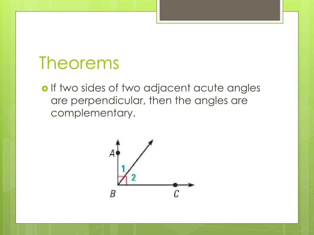 Theorems • If two sides of two adjacent acute angles are perpendicular, then the angles are complementary.